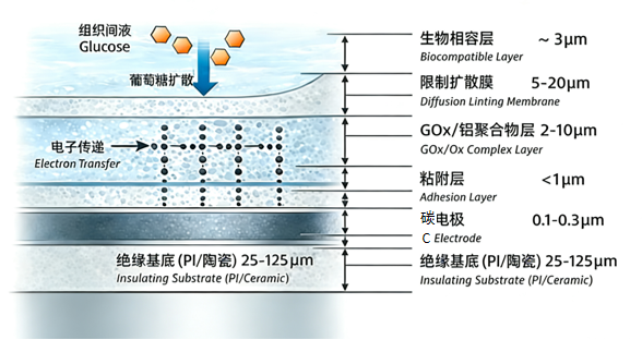 2. 在酶层与电极的界面提供保护。将酶及电子介体物理隔离于人体微环境之外,延缓酶活性衰减和介体泄漏,保障传感器的长期稳定性。